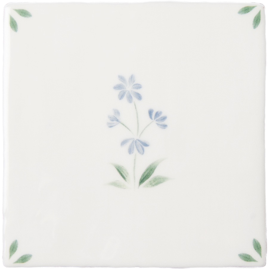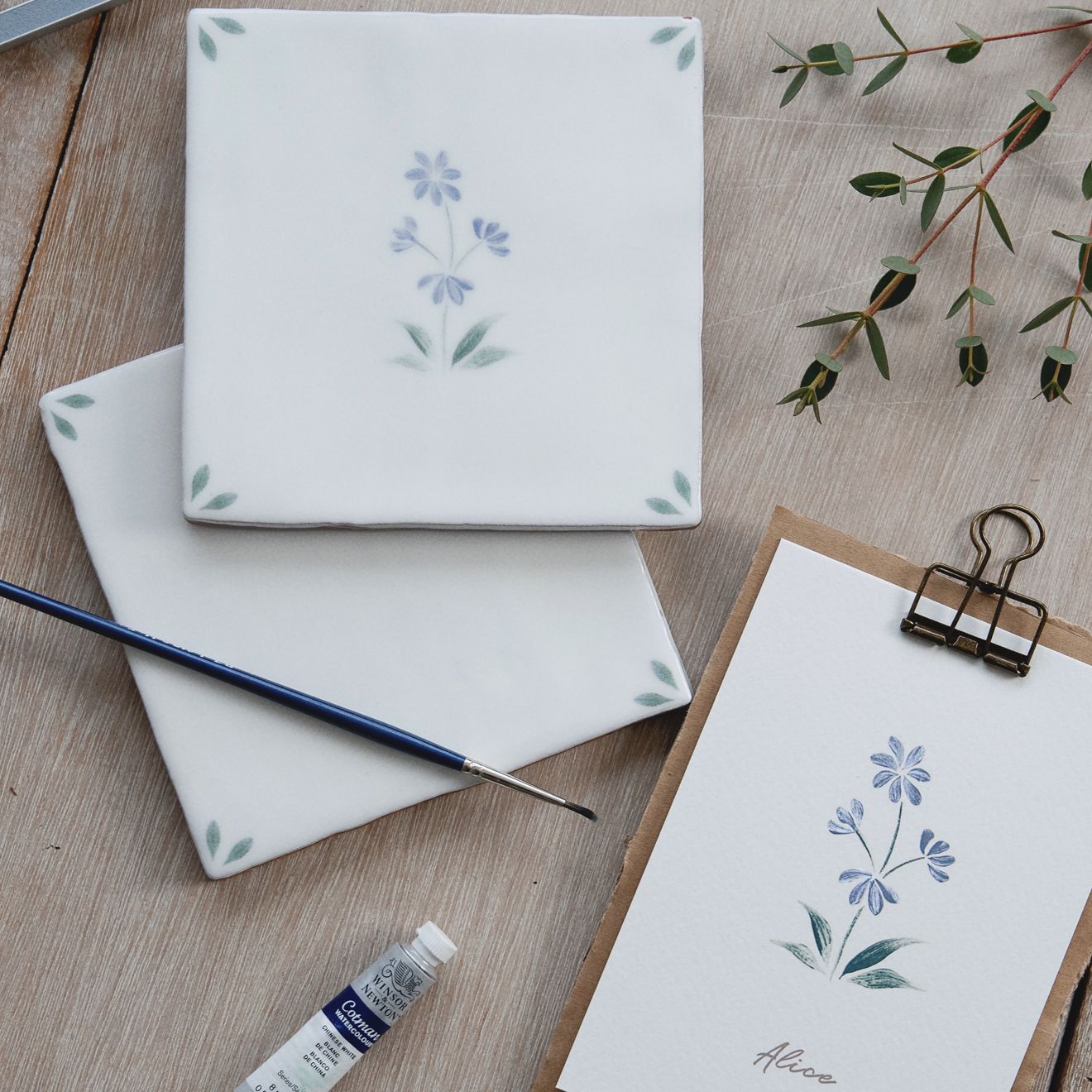Spring Alice features a delicate blue floral motif positioned at the centre of the tile, framed by green leaf details in each corner. These delightful designs are originated with hand painted watercolours. The images are digitally printed and fired onto rich white glazed tiles.