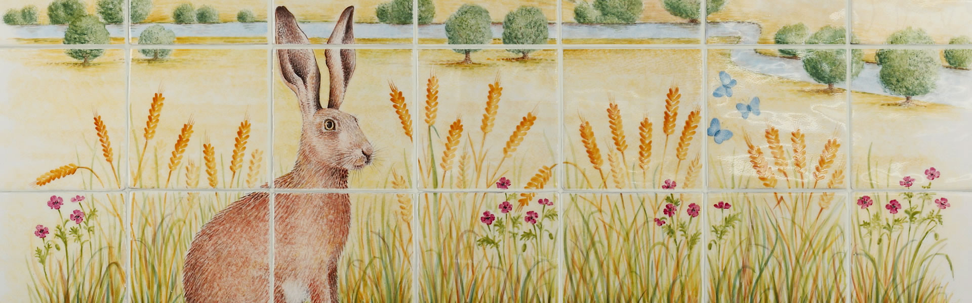 The tranquility of an English landscape with its meandering river is a perfect setting for this attentive hare. Our hand painted tile mural can be adapted to fit the space in your own kitchen, and just ask if you would like us to include one of your local landmarks. We can also include as many different types of bugs and insects as you want.